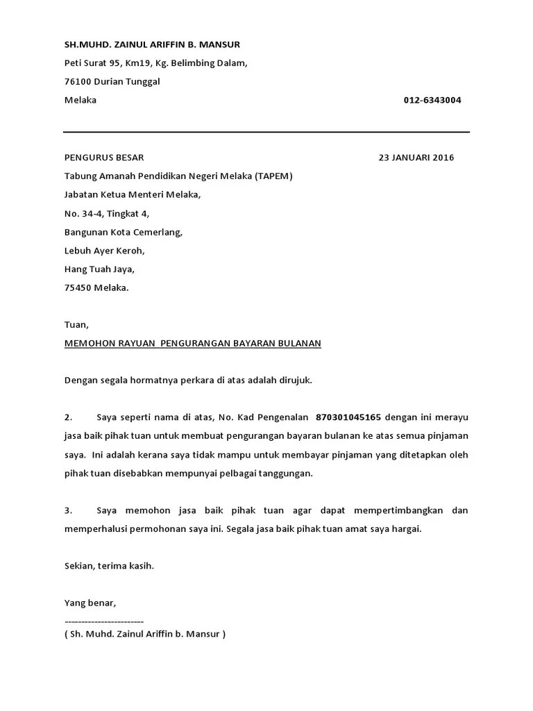 Contoh surat penangguhan bayaran balik mara dubai khalifa. Cara tangguh bayaran pinjaman loan kereta rumah personal. Contoh surat rasmi rayuan penangguhan .